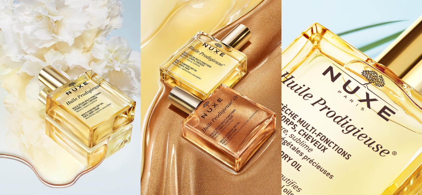 Para crear su Huile Prodigieuse®, NUXE ha seleccionado 7 aceites preciosos 100 % vegetales: Tsubaki, Argán, Macadamia, Borraja, Camelia, Avellana y Almendra dulce. Un frasco de Huile Prodigieuse® contiene un 25 % de Omega 3, 6 y 9.