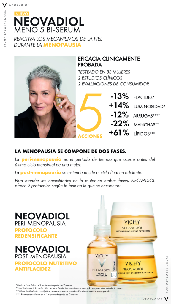 La línea Neovadiol de Vichy está específicamente desarrollada para cubrir las necesidades de la piel de las mujeres antes, durante y después de la menopausia. Está línea apunta a mejorar visiblemente los cambios clave que ocurren en la piel producto de las variaciones hormonales, es decir, es un tratamiento especializado para necesidades aún más específicas dentro del antiedad.